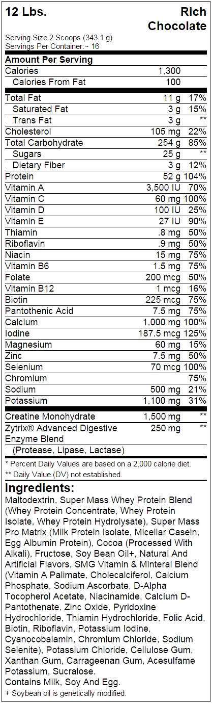 Dymatize supermas gainer merupakan susu yang didesain untuk beberapa orang yang sulit meningkatkan berat badan. orang orang dengan selera makan yang kecil sangat sulit untuk mendapatkan kalori tambahan dan protein tambahan untuk pertumbuhan otot. Di sinilah supermass datang dan memberikan solusi untuk permasalahan tersebut, dengan hampir 1300 kalori dan 50gr protein per servingnya membuat sebuah solusi untuk meningkatkan berat badan dan massa otot.